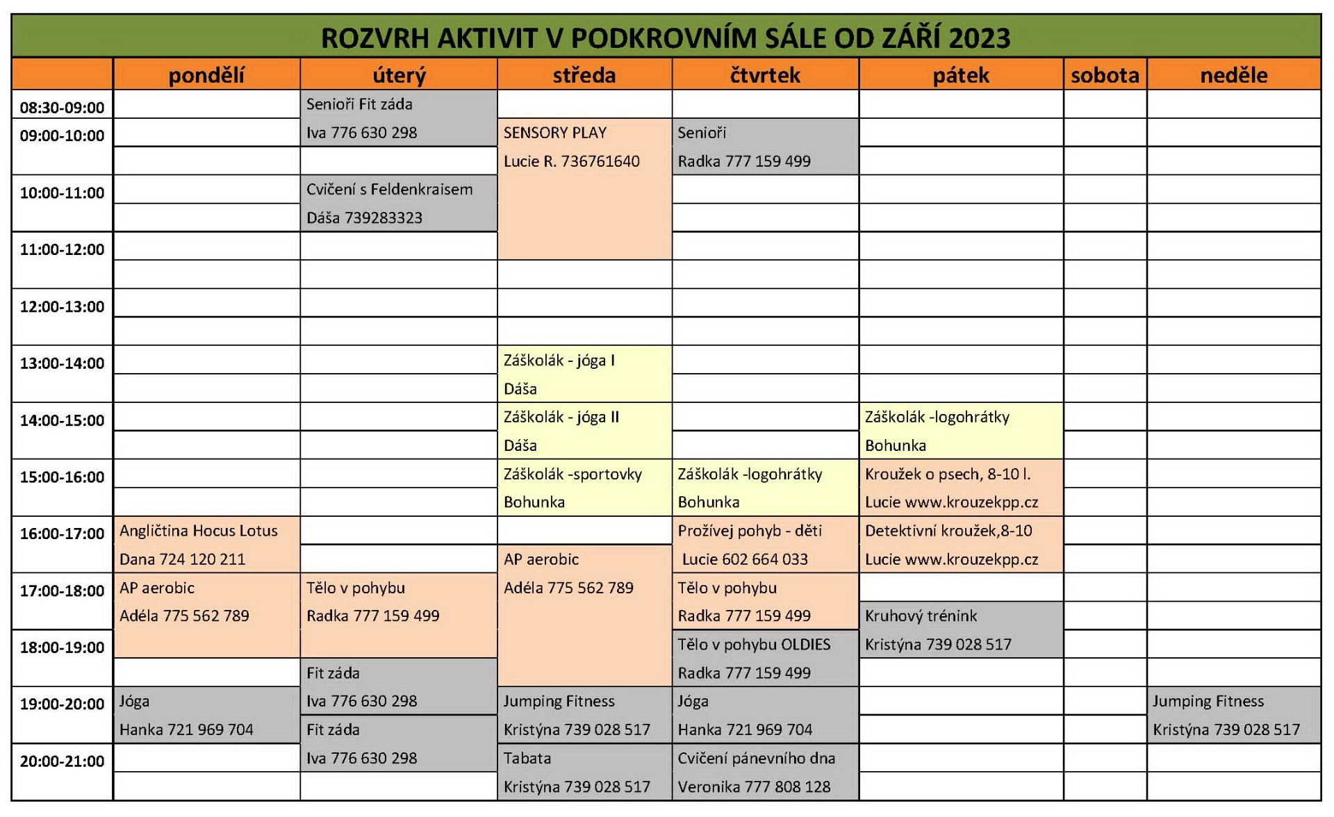 Oranžová okna označují aktivity pro děti, šedá pro dospělé. Pokud máte zájem o konkrétní lekci, kontaktujte prosím konkrétní lektorku/lektora